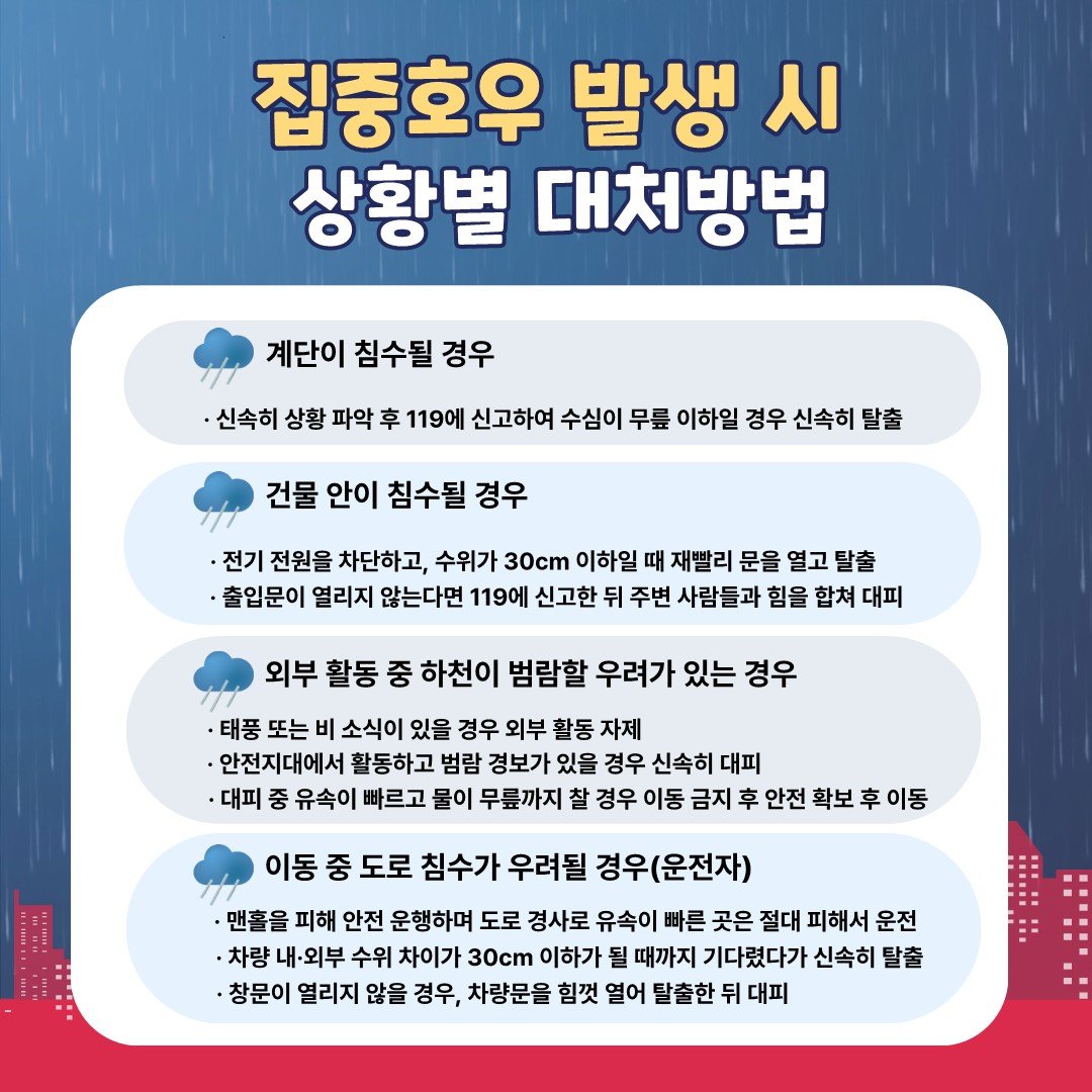 안내 파주시청소년지원센터 (안전정보) 여름철 집중되는 강수량 호우대비 안전정보 페이지 정보 조회수 : 1,977회 등록일 : 2025-07-24 본문 여름철에 집중되는 강수로 인한 안전사고를 예방하기 위하여 ‘여름철 집중되는 강수량 호우대비 안전정보를 배포합니다.참고하셔서 안전한 여름 보내시기를 바랍니다. 관련링크 https://www.pcy.or.kr/data/editor/2507/47ad959bddcaaaa69e585b2b6ccdc22… 1179회 연결 목록 이전글[경기도 꿈울림축제 사전 모집] 다음글[강남구청 인터넷수능방송(강남인강) 무료수강 신청자 모집]