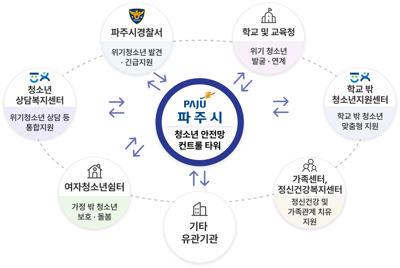 파주시청소년상담복지센터는 청소년안전망의 허브기관으로서 위기청소년 사례의 접수, 판정, 개입, 사후관리 전 과정을 총괄·조정하며, 지역사회 유관기관과의 협력체계를 구축·유지하여 통합적이고 체계적인 지원이 이루어지도록 허브 역할을 수행합니다.